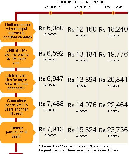 Choosing the right annuity structure Annuities refer to the stream of income an insurer pays at regular intervals until your death or the end of the tenure you may have opted for. The corpus at the end of the accumulation phase will be paid out in two parts -one-third as a lump sum and the balance being converted into annuities. You will need to buy annuities using the amount accumulated by your pension plan or any lump sum. The annuity option you choose will depend on your requirements and expectations from the plan. This will be applicable primarily to those investors who may have built the corpus through pension plans until January this year and others with a fund pool. |